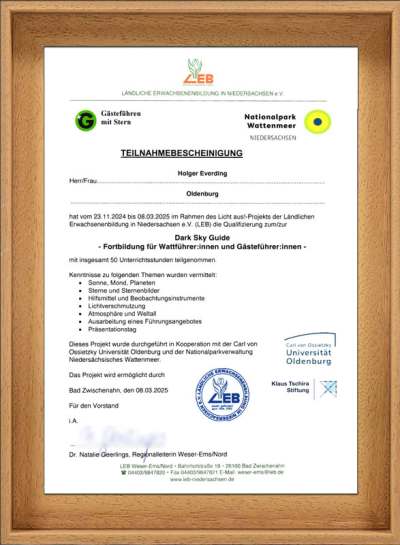 Der „Dark Sky Guide“-Lehrgang ist eine Weiterbildung für zertifizierte Nationalparks- und Landschaftsführer im Nationalpark Niedersächsisches Wattenmeer (sog. „ZNLer“). Ich habe erfolgreich teilgenommen, aber da ich kein ZNLer bin, bin ich kein Dark Sky Guide.